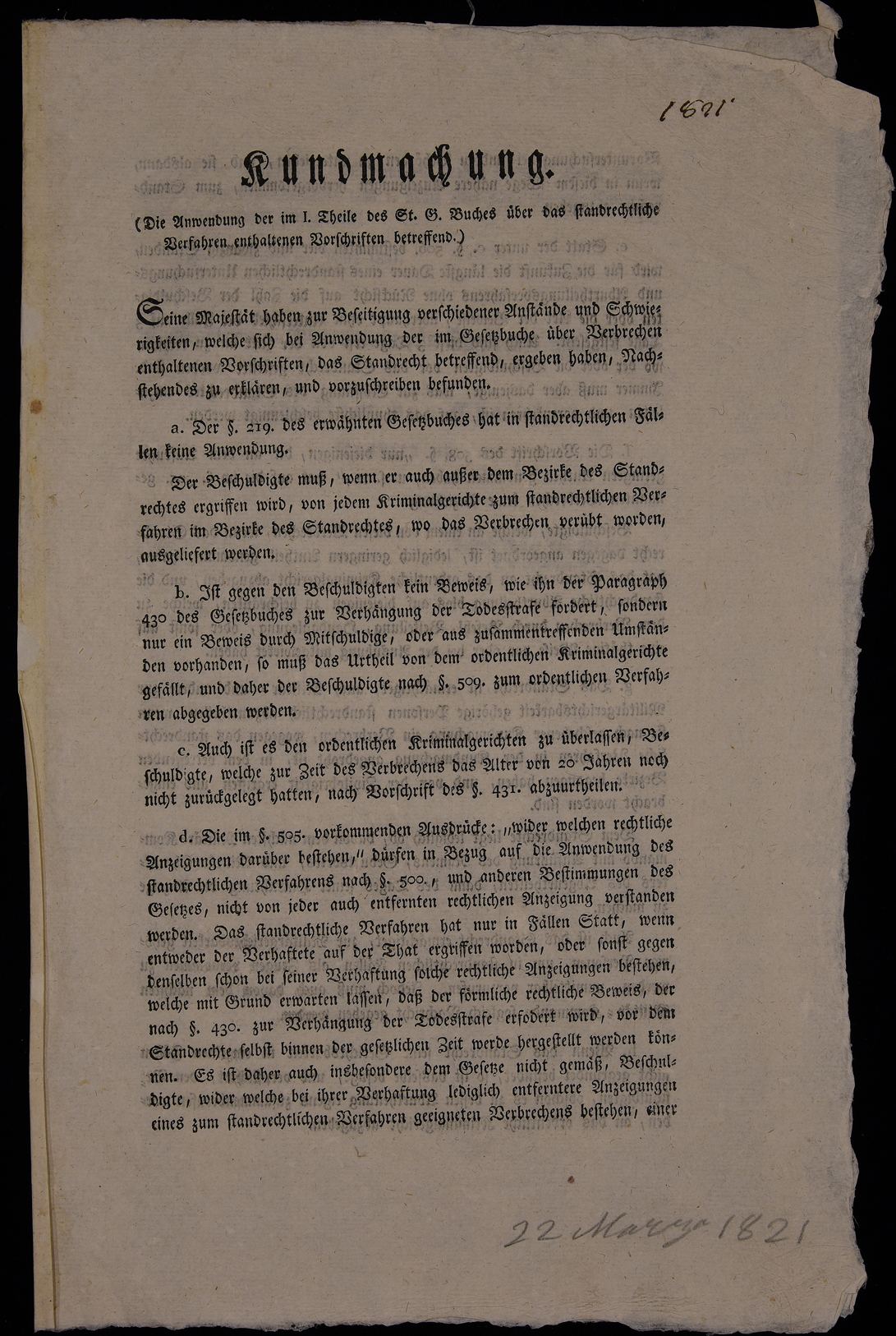 | Kundmachung. (Die Anwendung der im I. Theile des St. G. Buches über das standrechtliche Verfahren enthaltenen Vorschriften betreffend) |