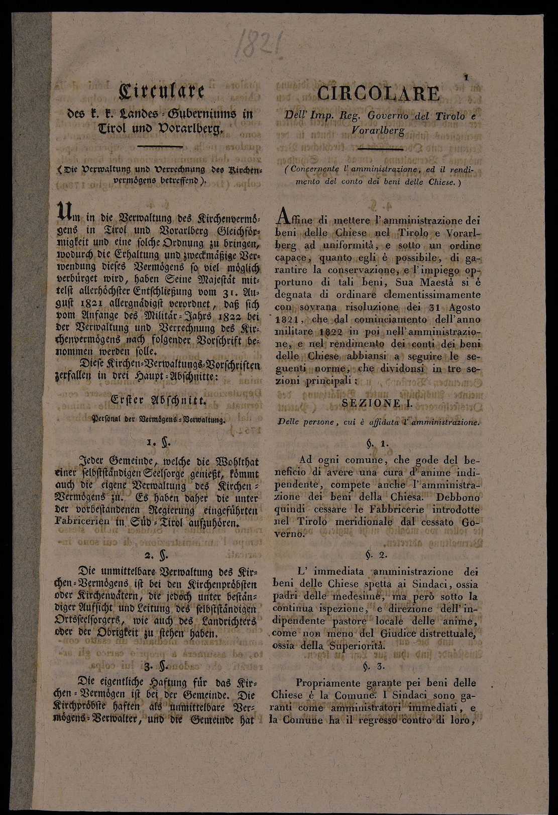 | Circolare dell'Imp. Reg. governo del Tirolo e Vorarlberg (concernente l'amministrazione, ed il rendimento del conto dei beni delle chiese) |