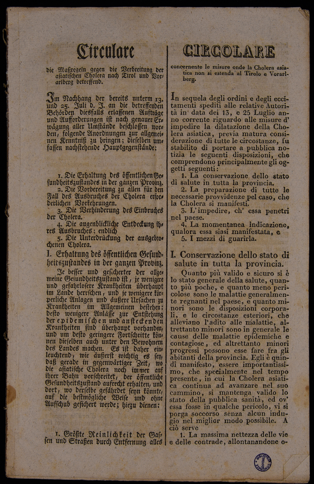 | Circolare concernente le misure onde la cholera asiatica non si estenda al Tirolo e Vorarlberg |