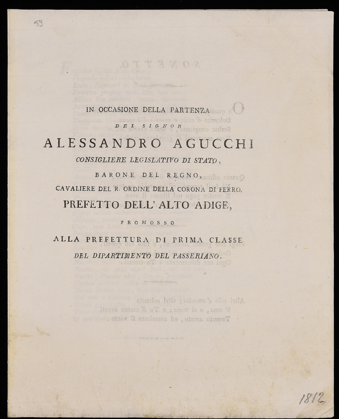 | In occasione della partenza del signor Alessandro Agucchi consigliere legislativo di Stato, barone del Regno ... |