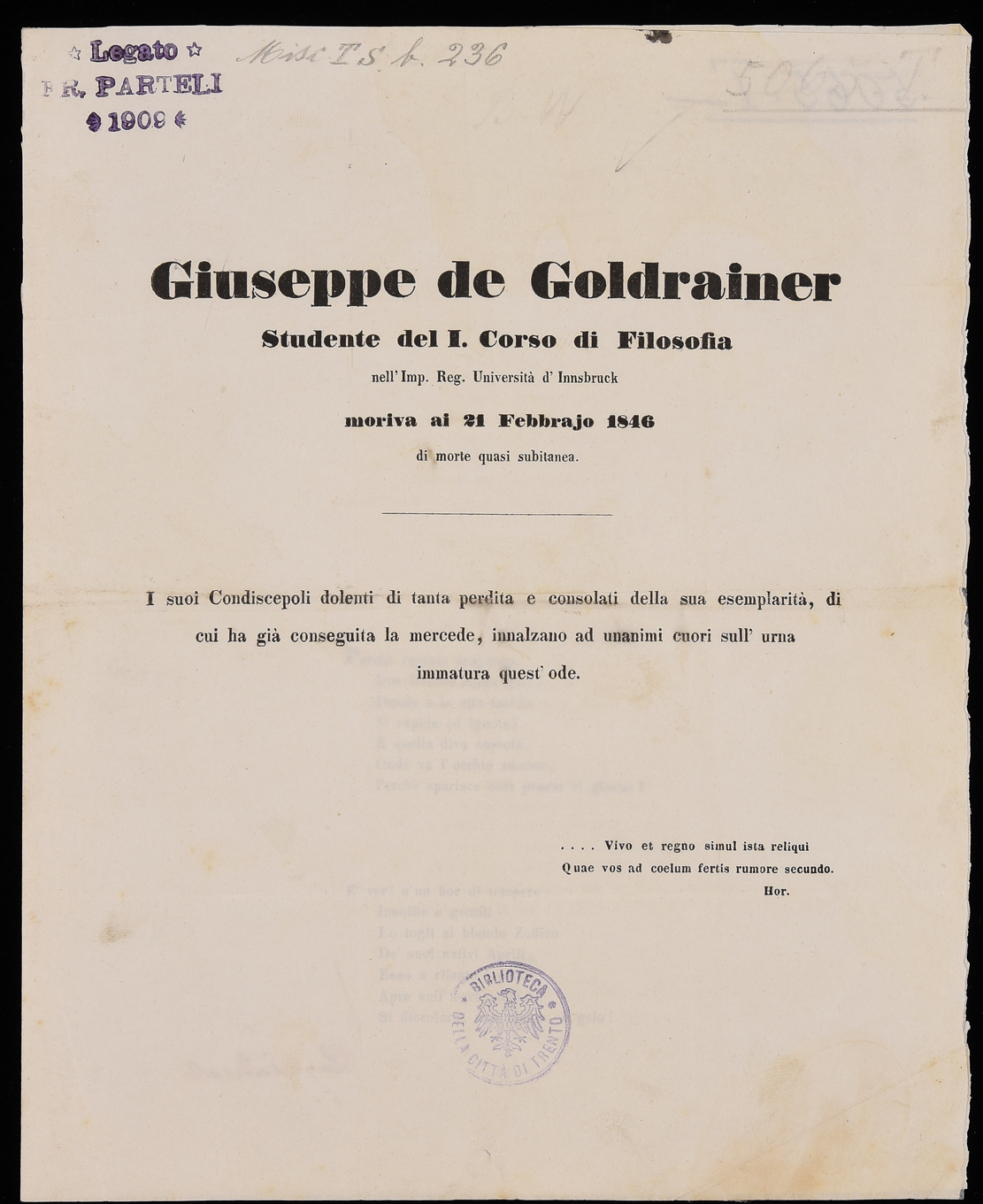 | Giuseppe de Goldrainer studente del I. corso di Filosofia nell'Imp. Reg. Università d'Innsbruck moriva ai 21 febbrajo 1846 di morte quasi subitanea ... |