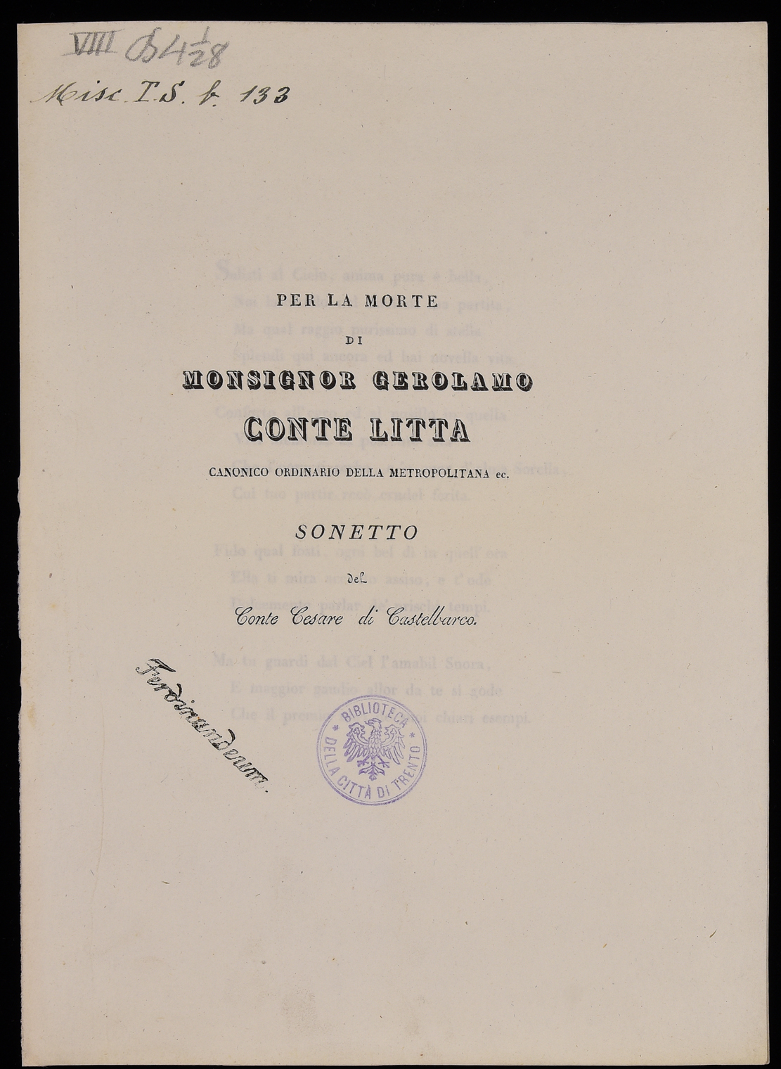| Per la morte di monsignor Gerolamo conte Litta canonico ordinario della Metropolitana ec., sonetto del conte Cesare di Castelbarco |