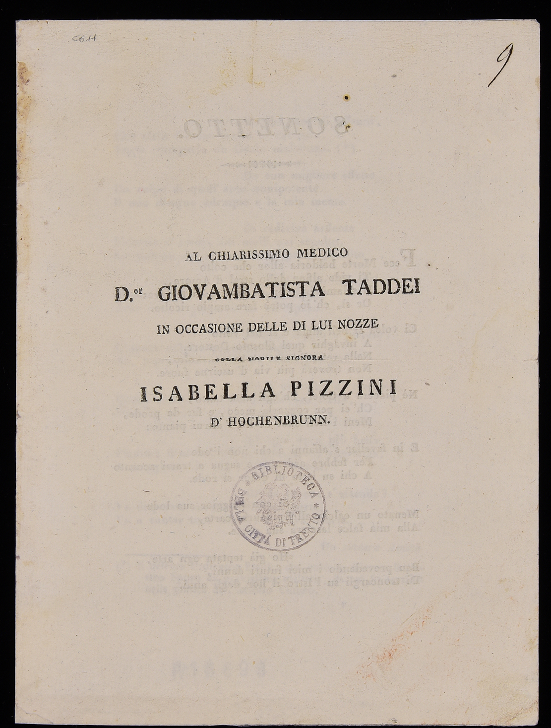 | Al chiarissimo medico d.or Giovambatista Taddei in occasione delle di lui nozze colla nobile signora Isabella Pizzini d'Hochenbrunn |