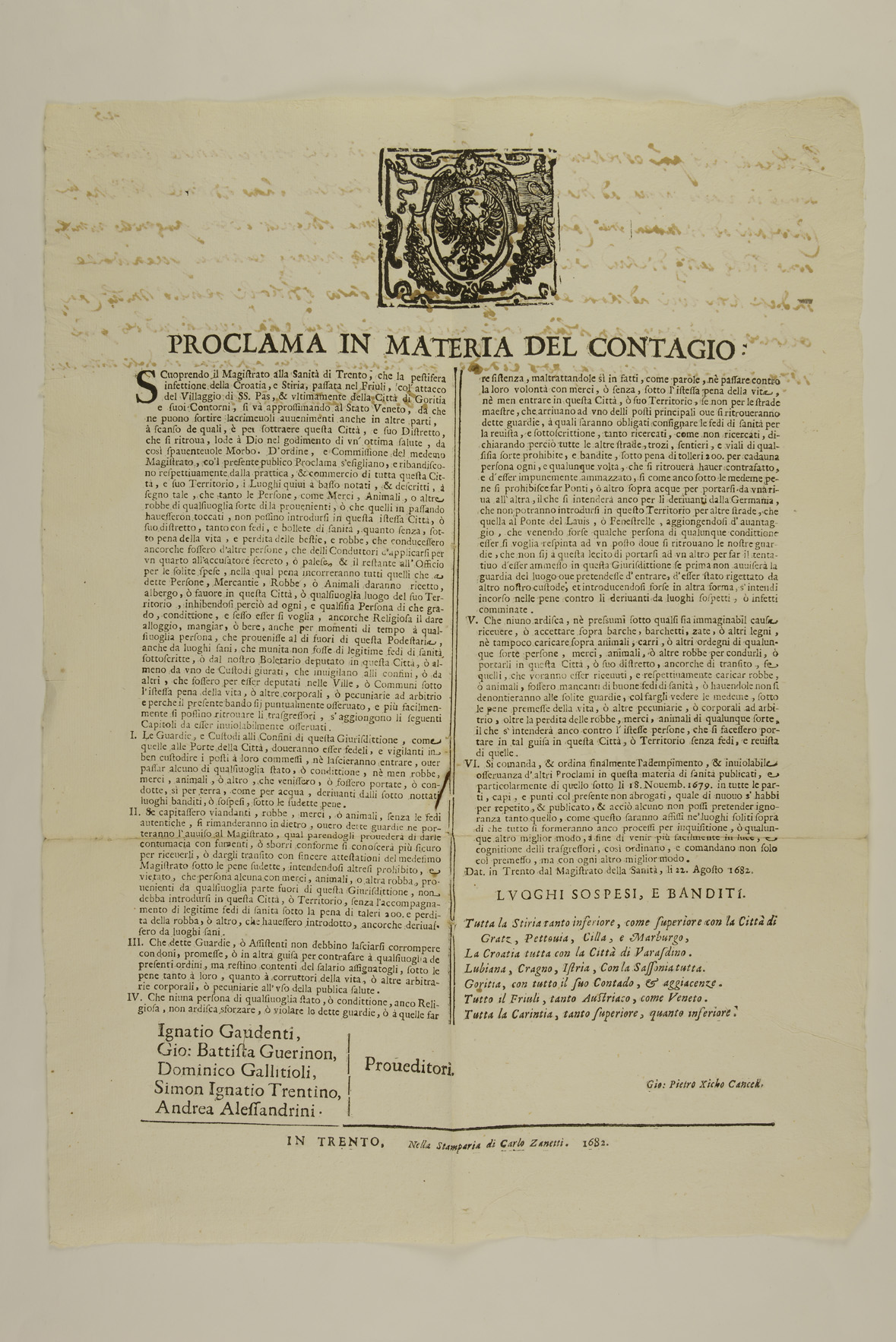 Proclama sulla prevenzione dei contagi emanato il 22 agosto 1682 dall’Ufficio della sanità della città di Trento, sottoscritto da Giovanni Piero Sizzo, sono presenti i nomi dei provveditori: Ignazio Gaudenti, Giovanni Battista Guerinoni, Domenico Gallizioli, Simone Ignazio Trentino e Andrea Alessandrini