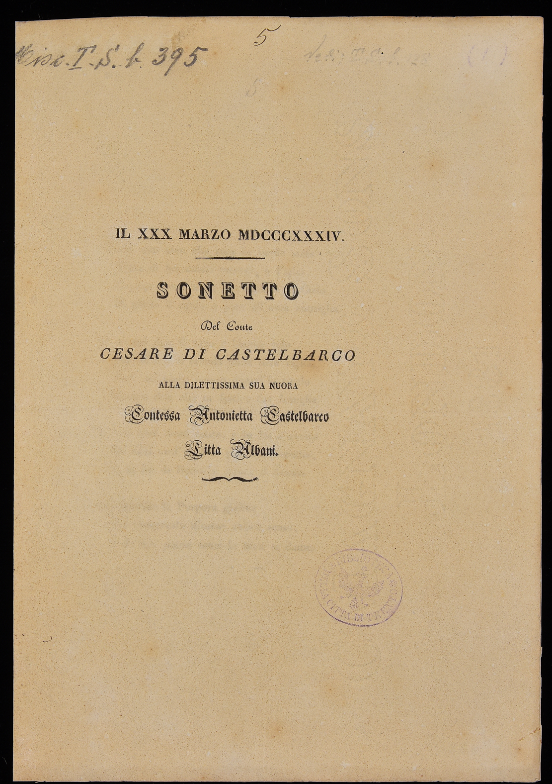 Il XXX marzo MDCCCXXXIV, sonetto del conte Cesare di Castelbarco alla...