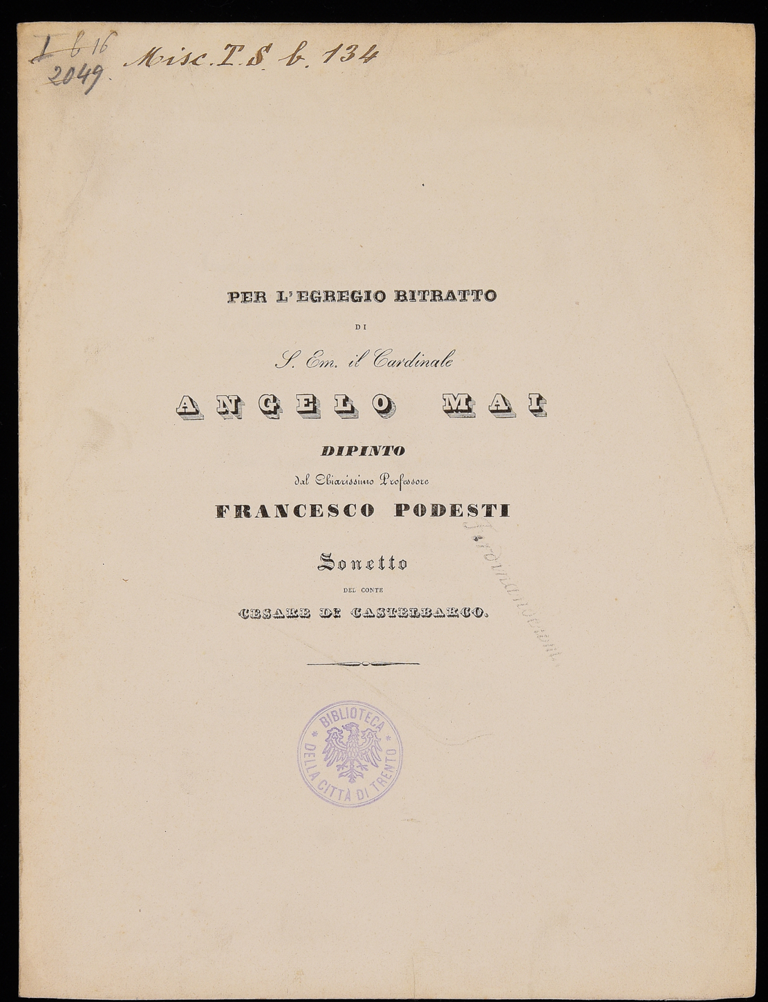 | Per l'egregio ritratto di S. Em. il cardinale Angelo Mai dipinto dal chiarissimo professore Francesco Podesti, sonetto del conte Cesare di Castelbarco |