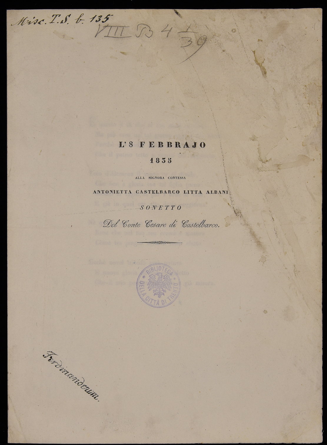 L'8 febbrajo 1835 alla signora contessa Antonietta Castelbarco Litta Albani,...