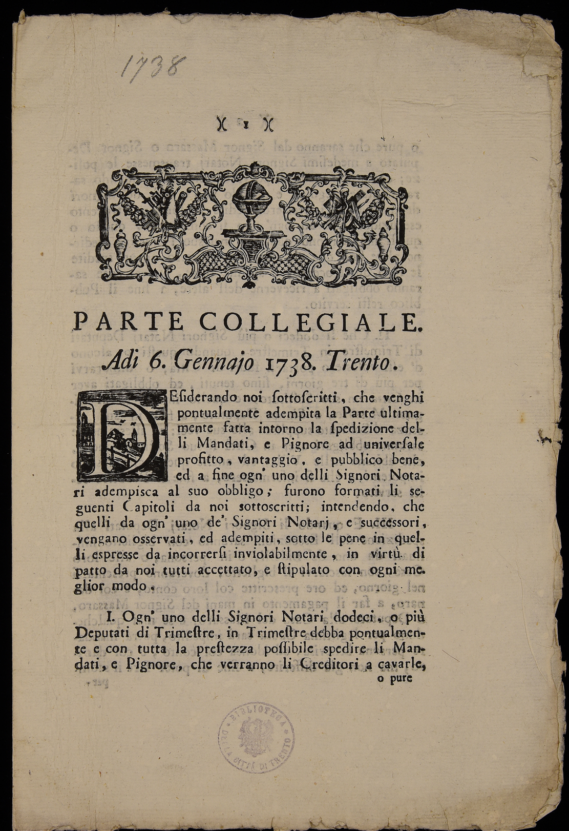 | Parte collegiale. Adi 6. gennaio 1738. Trento |