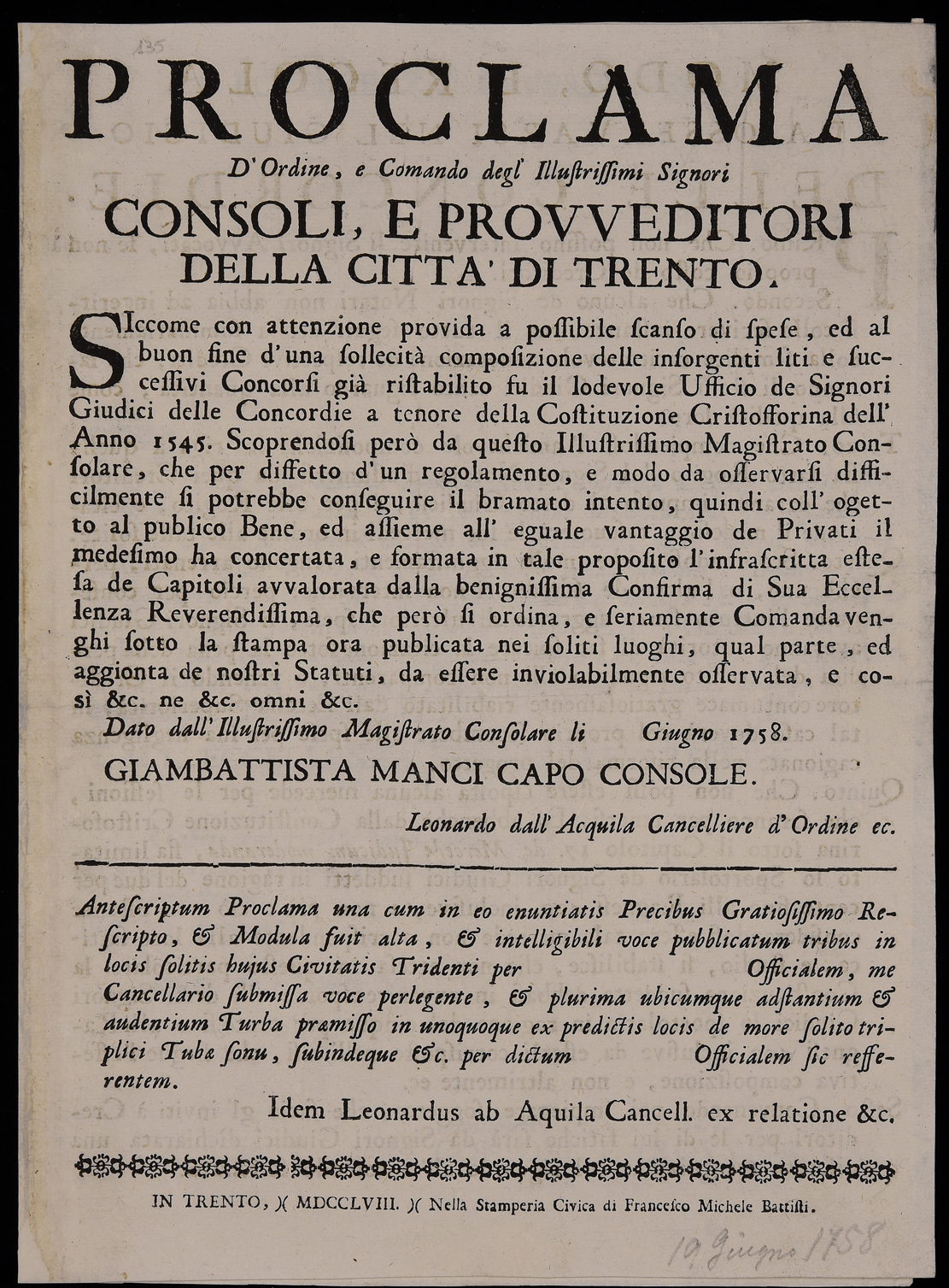 [4] p. Proclama sui giudici delle concordie emanato nel giugno 1758 dal Magistrato consolare di Trento, sottoscritto da Giambattista Manci (capo console) e da Leonardo dell'Acquila (cancelliere).