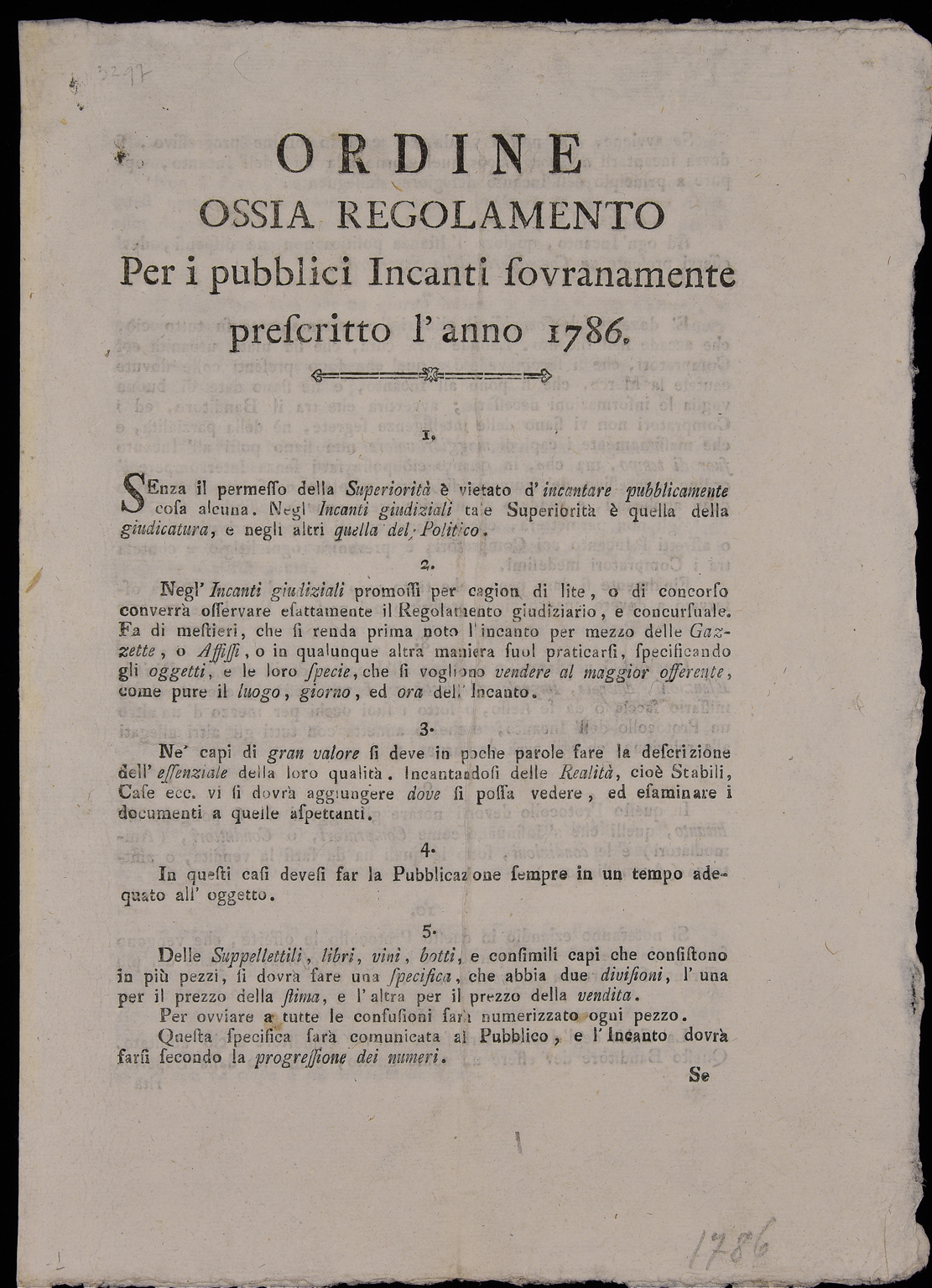 | Ordine ossia regolamento per i pubblici incanti sovranamente prescritto l'anno 1786 |