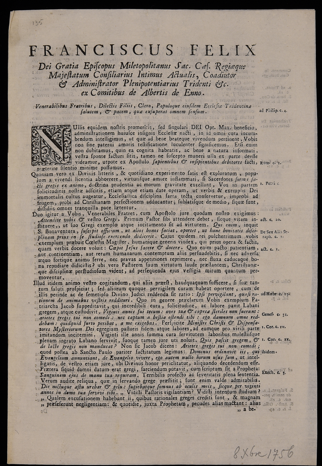 | Franciscus Felix Dei gratia episcopus Miletopolitanus Sac. Caes. Regiaeque Majestatum consiliarius intimus actualis, coadiutor & administrator plenipotentiarius Tridenti &c. ex comitibus de Albertis de Enno. Venerabilibus fratribus, dilectis filiis, clero, populoque eiusdem ecclesiae Tridentinae salutem, & pacem, quae exsuperat omnem sensum |
