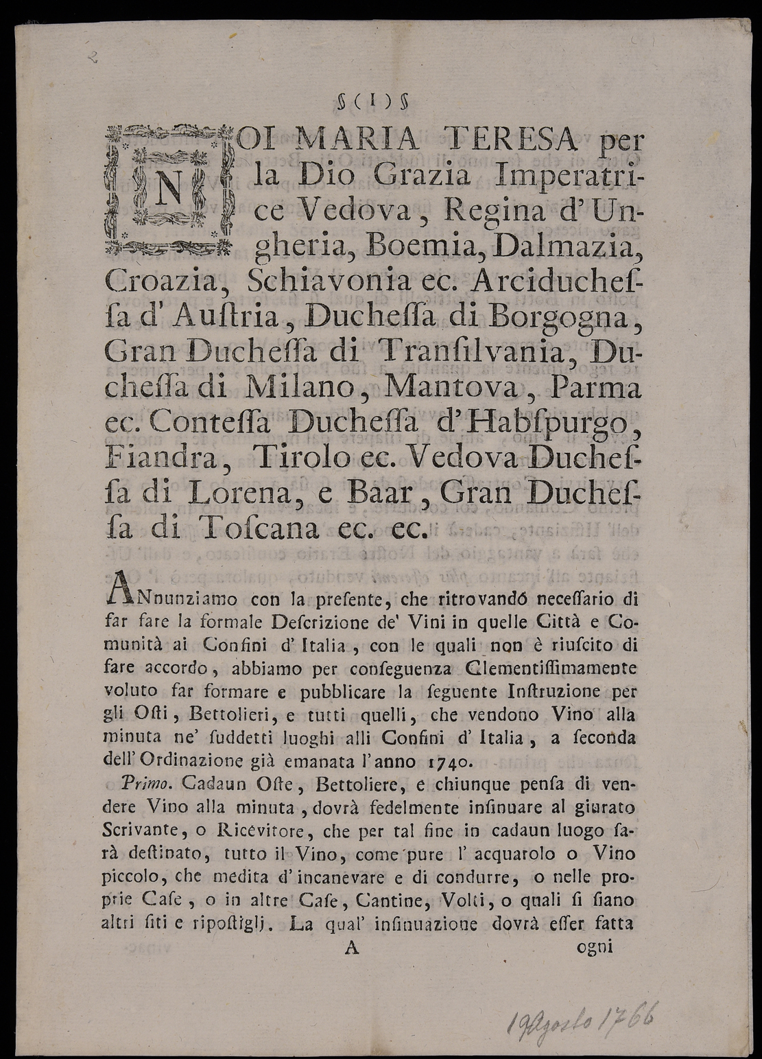 | Noi Maria Teresa per la Dio grazia imperatrice vedova, regina d'Ungheria, Boemia, Dalmazia, Croazia, Schiavonia ec. Arciduchessa d'Austria, Duchessa di Borgogna, Gran duchessa di Transilvania, Duchessa di Milano, Mantova, Parma ec. Contessa duchessa d'Habspurgo, Fiandra, Tirolo ec. Vedova duchessa di Toscana ec. ec. |