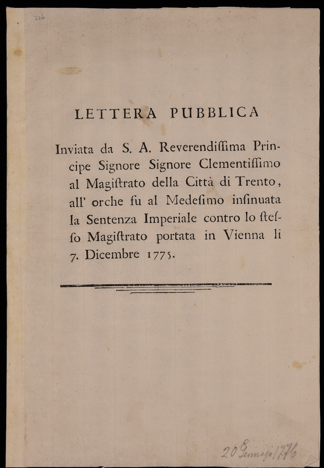 | Lettera pubblica inviata da S.A. reverendissima Principe signore signore clementissimo al magistrato della città di Trento ... |
