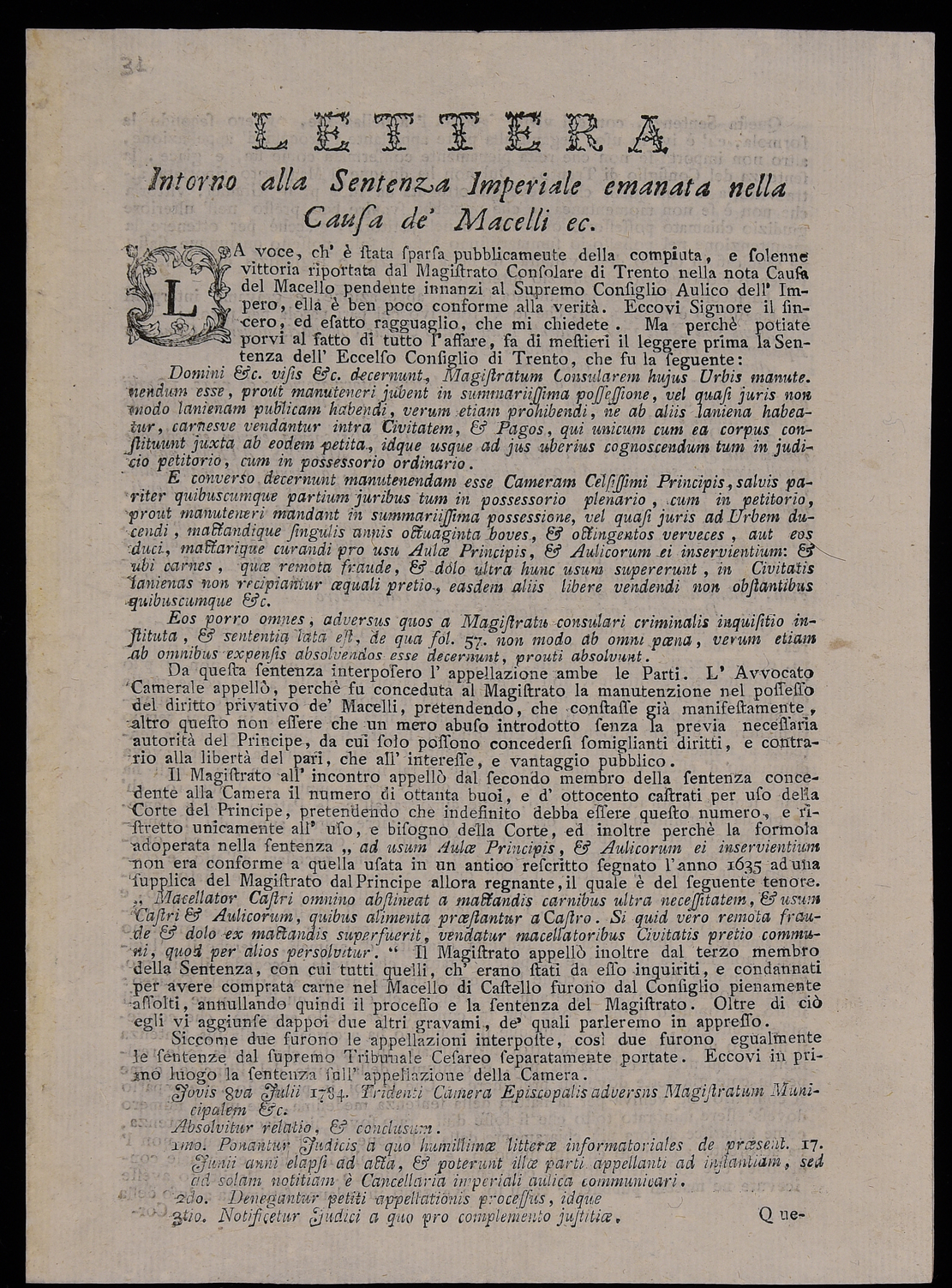 Lettera intorno alla sentenza imperiale emanata nella causa de' macelli ec.