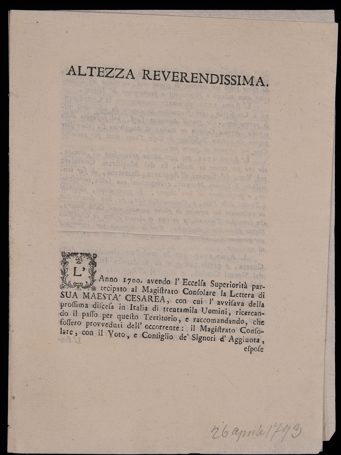 L'anno 1700 avendo l'eccelsa superiorità partecipato al magistrato consolare la lettera di sua maestà cesarea con cui l'avvisava della prossima discesa in Italia di trentamila uomini ...