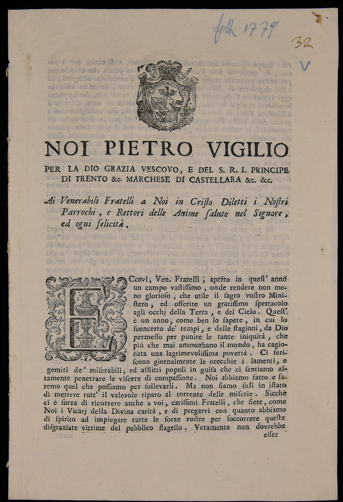 | Noi Pietro Vigilio per la Dio grazia vescovo, e del S. R. I. principe di Trento &c. marchese di Castellara &c. &c., ai venerabili fratelli a noi in Cristo diletti i nostri parrochi e rettori delle anime salute nel Signore e ogni felicità |