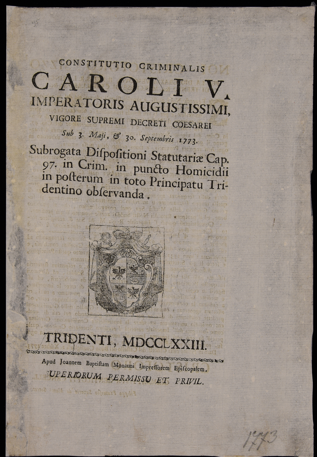 | Constitutio criminalis Caroli V imperatoris augustissimi, vigore supremi decreti coesarei, sub 3 Maii, et 30 Septembris 1773, subrogata dispositioni statutariae cap. 97 in crim. in puncto homicidii in posterum in toto principatu tridentino observanda |