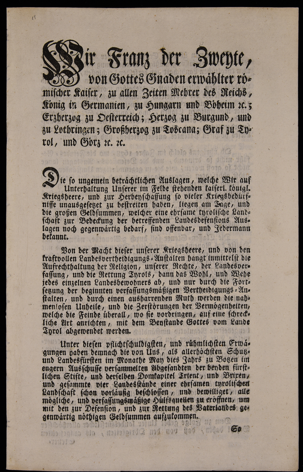 | Wir Franz der Zweyte von Gottes Gnaden erwaehlter roemischer Kaiser, zu allen Zeiten Mehrer des Reichs Koenig in Germanien, zu Hungarn und Boeheim etc. Erzherzog zu Oesterreich, Herzog zu Burgund und zu Lothringen, Grossherzog zu Toscana, Graf zu Tyrol und Goerz etc. etc. |