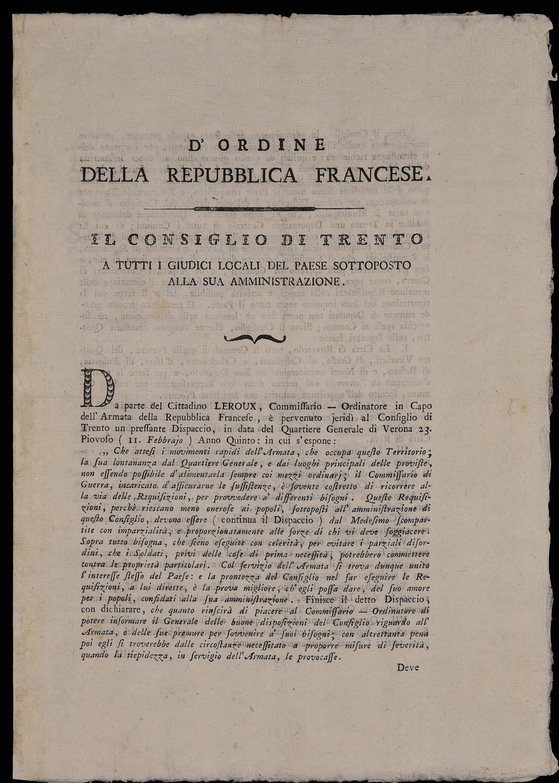 Da parte del cittadino Leroux, commissario - ordinatore in capo dell'Armata della Repubblica Francese è pervenuto ieridì al Consiglio di Trento un pressante dispaccio ...