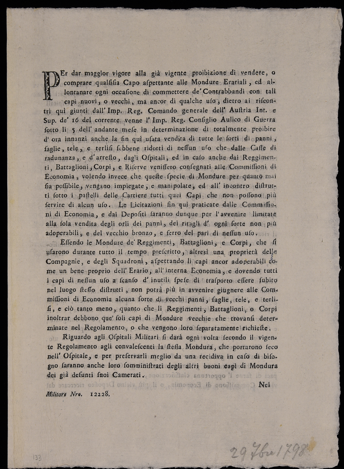 | Per dar maggior vigore alla già vigente proibizione di vendere o comprare qualsisia capo aspettante alle mondure erariali ... |