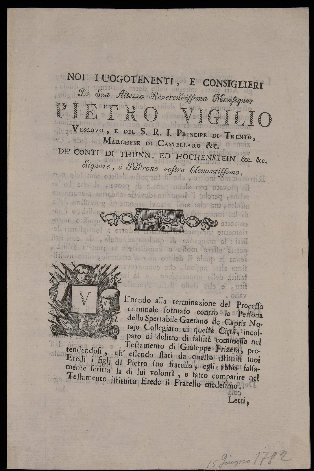 | Noi luogotenenti, e consiglieri di sua altezza reverendissima monsignor Pietro Vigilio vescovo, e del S.R.I. principe di Trento, marchese di Castellaro &c. de' conti di Thunn, ed Hochenstein &c. &c. signore, e padrone nostro clementissimo |
