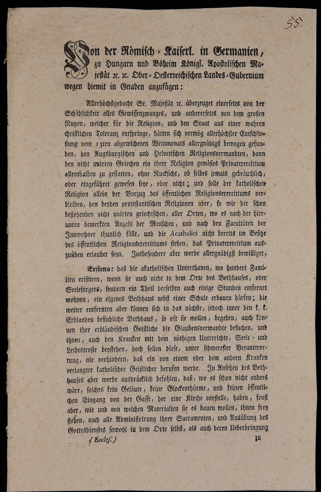 Allerhöchstgadacht Se. Majestät etc. überzeuget einerseits von der Schädlichkeit alles Gewissenzwanges ...