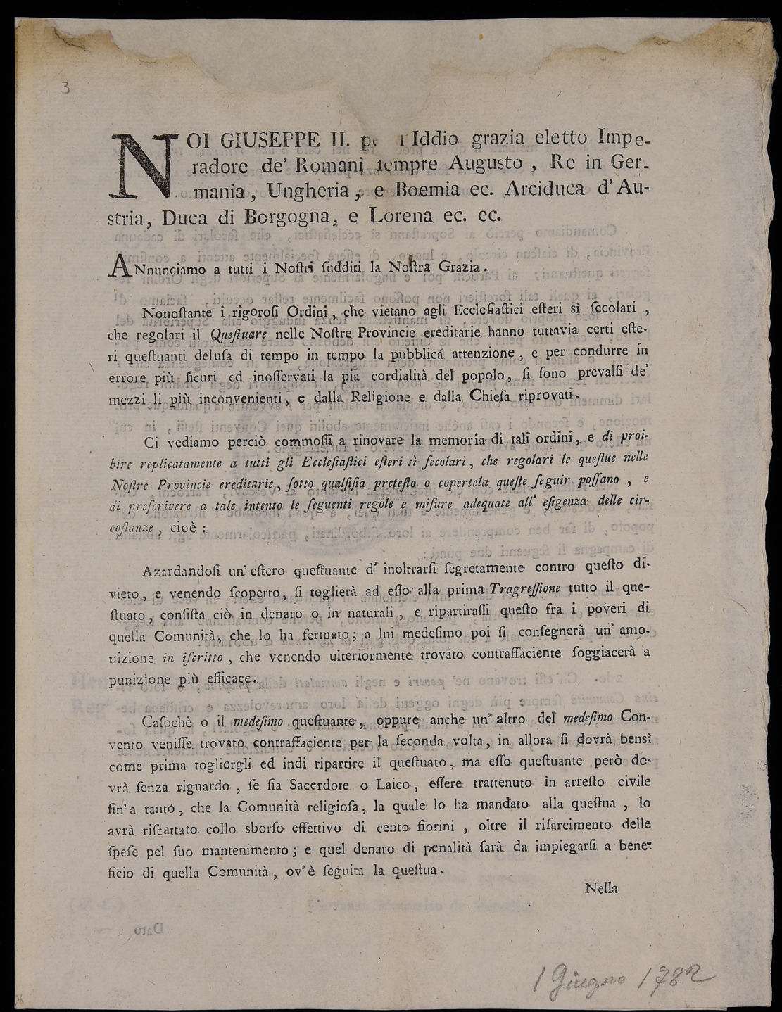 | Noi Giuseppe II per l'Iddio grazia eletto imperadore de' romani sempre Augusto, re in Germania,Ungheria, e Boemia ec. arciduca d'Austria, duca di Borgogna, e Lorena ec. ec. Annunciamo a tutti i nostri sudditi la nostra grazia |