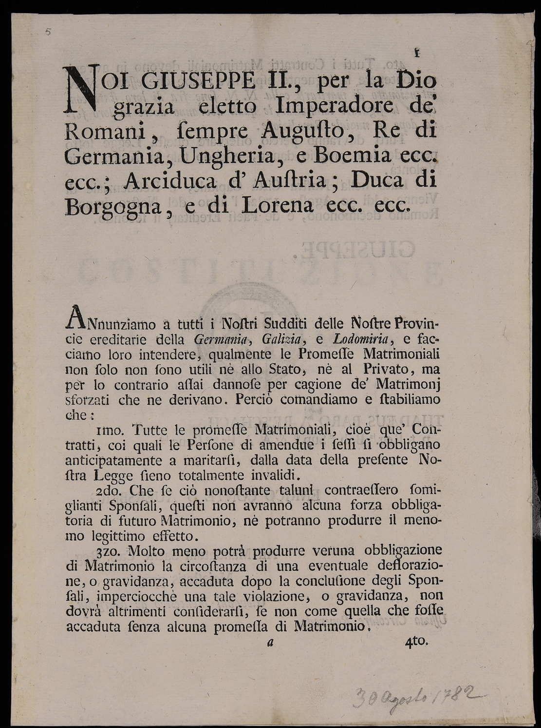 | Noi Giuseppe II per la Dio grazia eletto imperadore de' Romani sempre Augusto re di Germania, Ungheria, e Boemia ecc. ecc. arciduca d'Austria, duca di Borgogna e di Lorena ecc. ecc. |