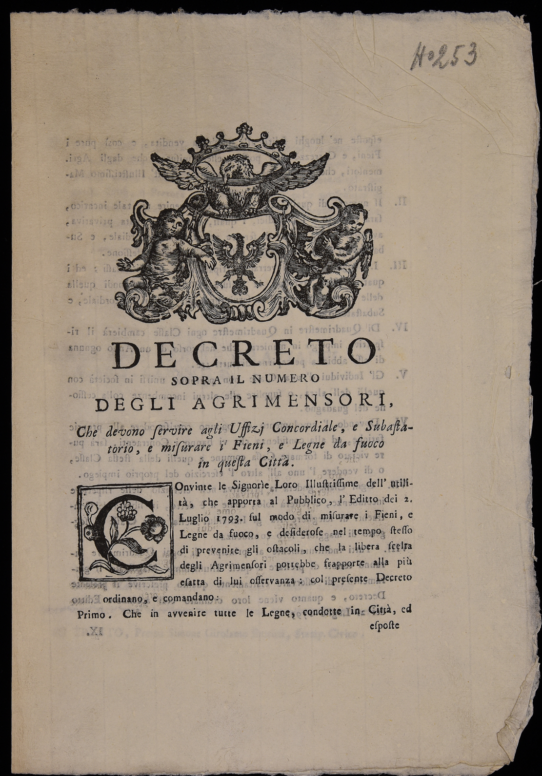| Decreto sopra il numero degli agrimensori, che devono servire agli Uffizi concordiale e subastatorio e misurare i fieni e legne da fuoco in questa città |