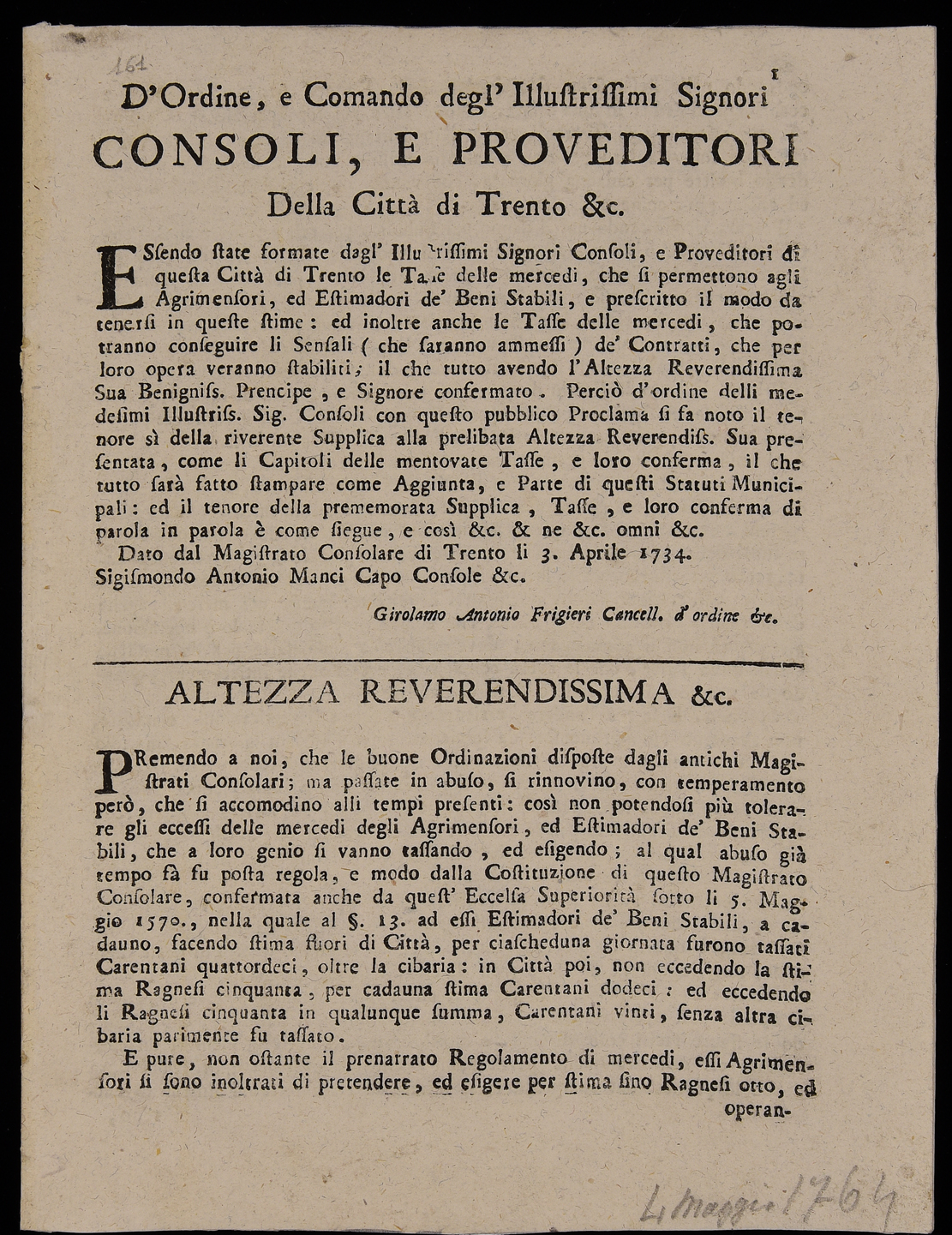 8 p. Proclama sulle tariffe degli agrimensori, stimatori e sensali emanato il 4 maggio 1764 dal Magistrato consolare di Trento
