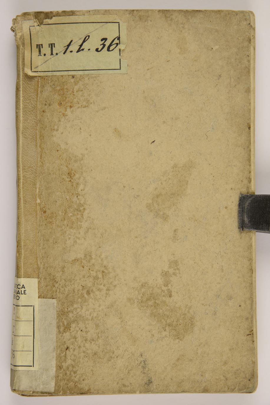 Legatura in cartoncino, rinforzo pergamenaceo al dorso, talloncino cartaceo al dorso con antica segnatura di collocazione, coperto da uno successivo, 'R' manoscritta al dorso, mm. 155x95x10, ex libris della Biblioteca al verso del piatto anteriore, timbri della Biblioteca al verso del frontespizio, numero d'inventario X/1655 a c. F8v, provenienza: Collezione Mazzetti, antiche segnature di collocazione: TT 1 b 36.
