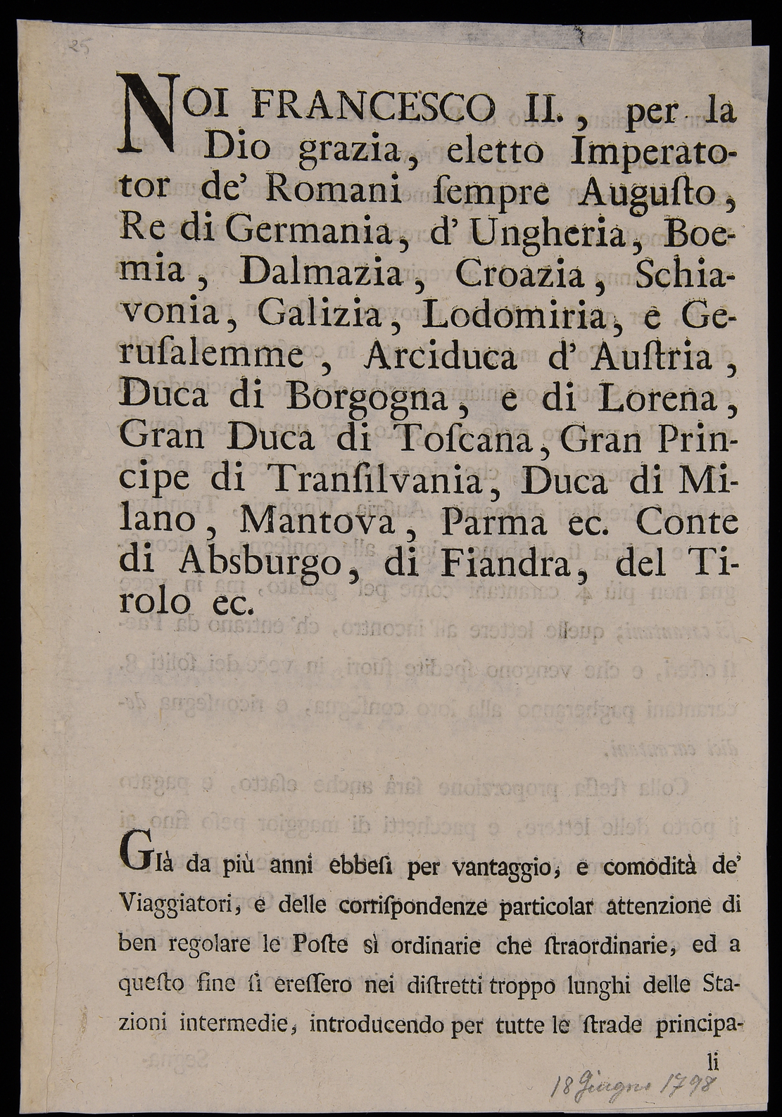| Noi Francesco II per la Dio grazia eletto imperator de' Romani sempre Augusto re di Germania, d'Ungheria, Boemia, Dalmazia, Croazia, Schiavonia, Galizia, Lodomiria, e Gerusalemme, arciduca d'Austria, duca di Borgogna, e di Lorena, gran duca di Toscana, gran principe di Milano, Mantova, Parma ec. conte di Absburgo, di Fiandra, del Tirolo ec. |