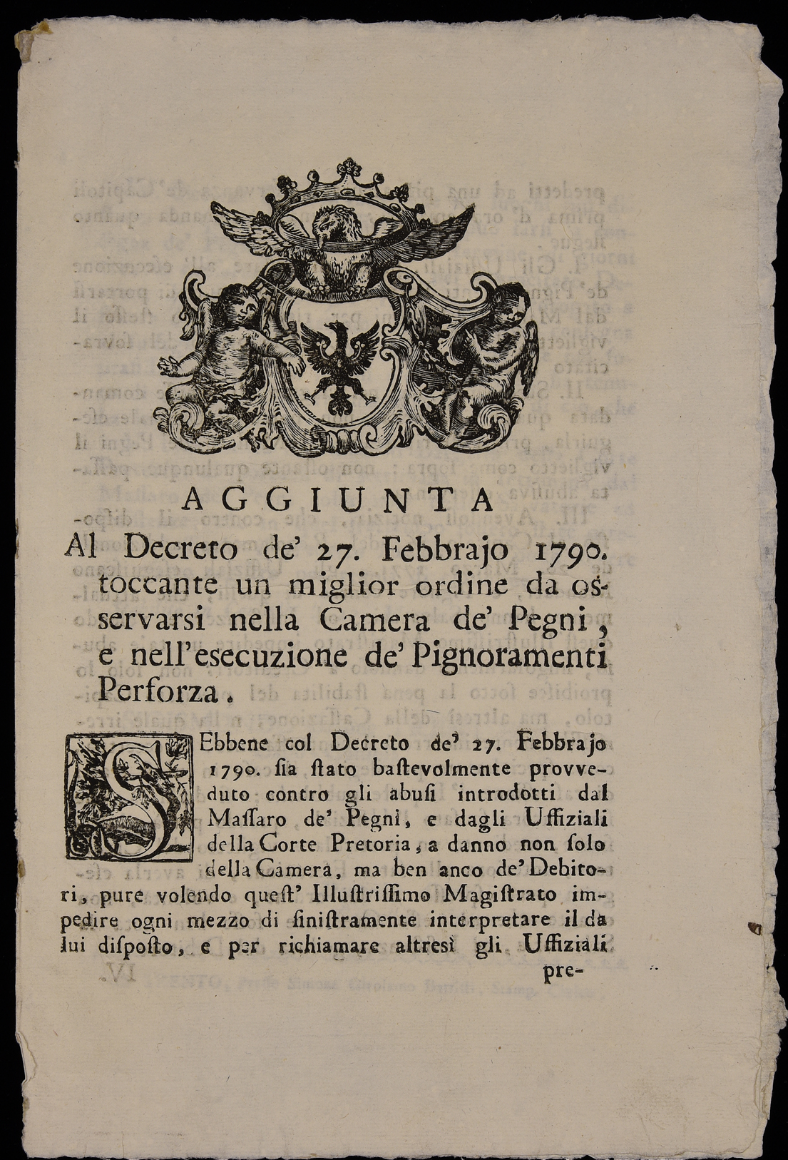 | Aggiunta al Decreto de' 27 febbraio 1790 toccante un miglior ordine da osservarsi nella Camera de' Pegni, e nell'esecuzione de' pignoramenti perforza |