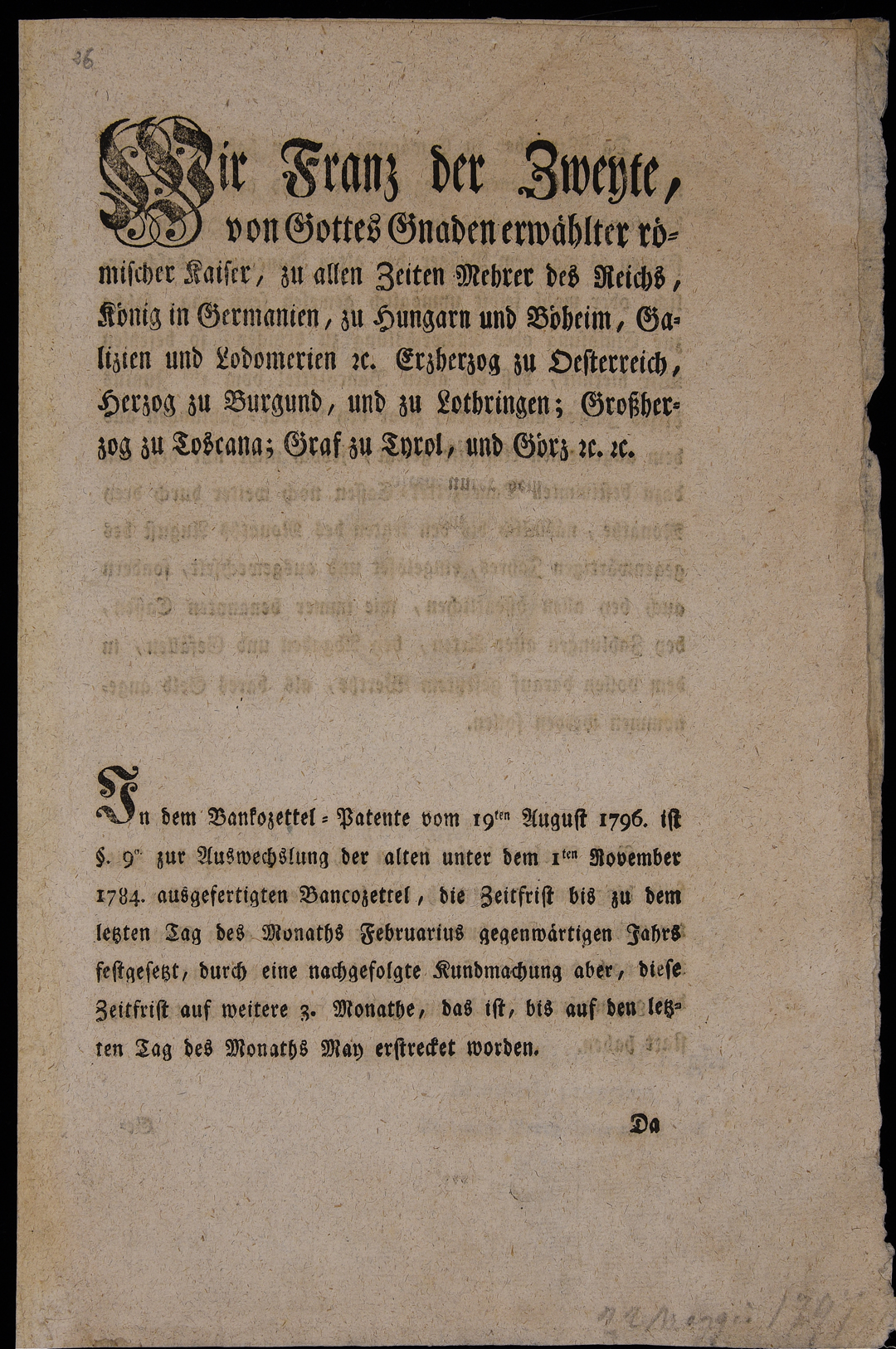 | Wir Franz der Zweyte von Gottes Gnaden erwählter römischer Kaiser, zu allen Zeiten Mehrer des Reichs König in Germanien, zu Hungarn und Böheim, Galizien, Lodomerien etc. Erzherzog zu Oesterreich, Herzog zu Burgund und zu Lothringen, Grossherzog zu Toscana, Graf zu Tyrol und Görz etc. etc. |