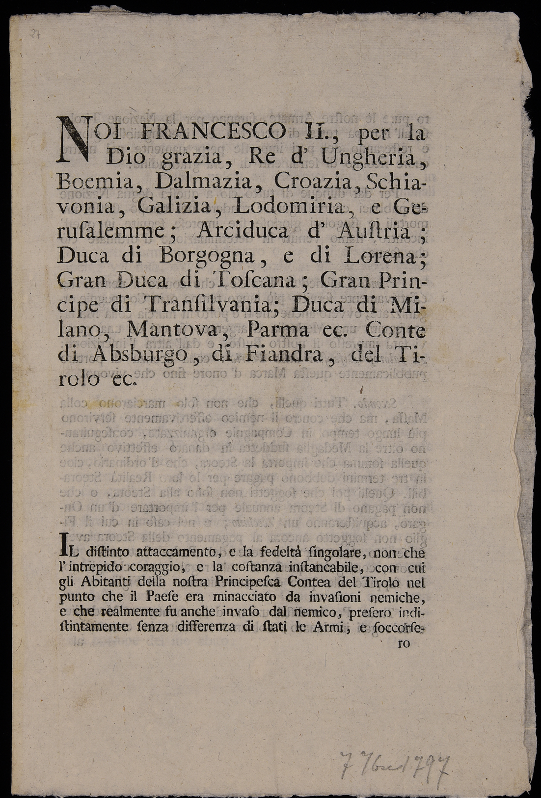 | Noi Francesco II per la Dio grazia re d'Ungheria, Boemia, Dalmazia, Croazia, Schiavonia, Galizia, Lodomiria, e Gerusalemme, arciduca d'Austria, duca di Borgogna, e di Lorena, gran duca di Toscana, gran principe di Transilvania, duca di Milano, Mantova, Parma ec. conte di Absburgo, di Fiandra, del Tirolo ec. |