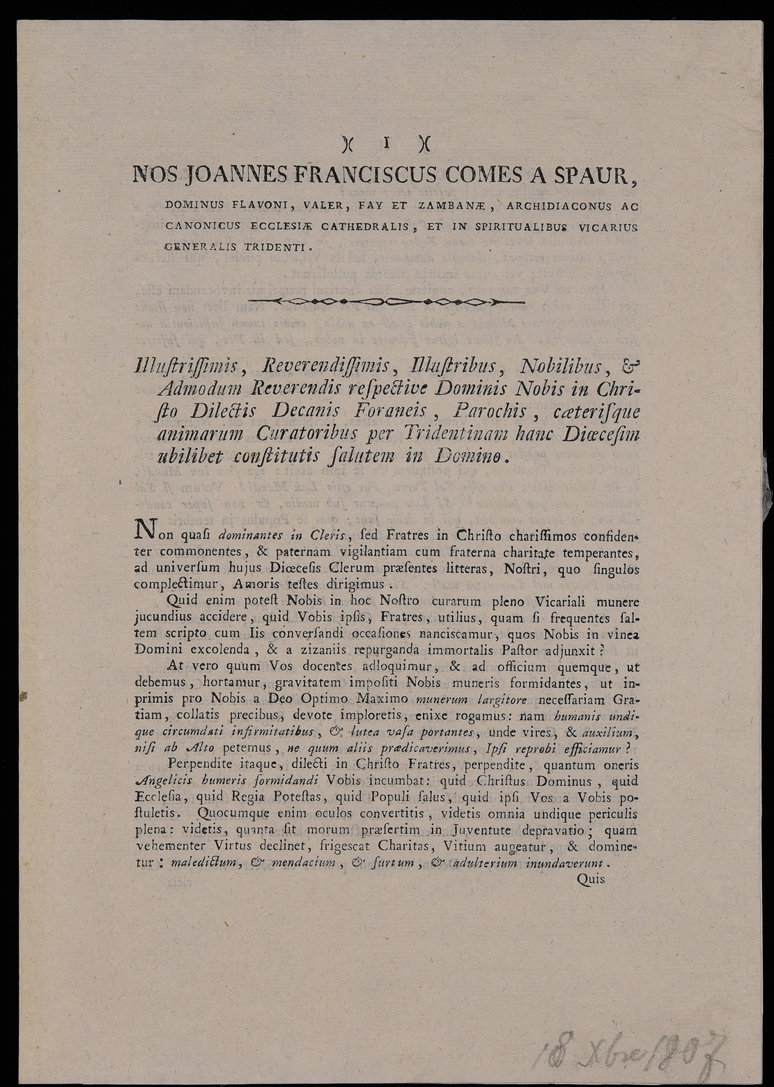 | Nos Joannes Franciscus comes a Spaur, dominus Flavoni, Valer, Fay et Zambanae, archidiaconus ac canonicus ecclesiae cathedralis et in spiritualibus vicarius generalis Tridenti, illustrissimis, reverendissimis, illustribus, nobilibus & admodum reverendis respective dominis nobis in Christo dilectis decanis foraneis, parochis, caeterisque animarum curatoribus per Tridentinam hanc dioecesim ubilibet constitutis salutem in Domino |