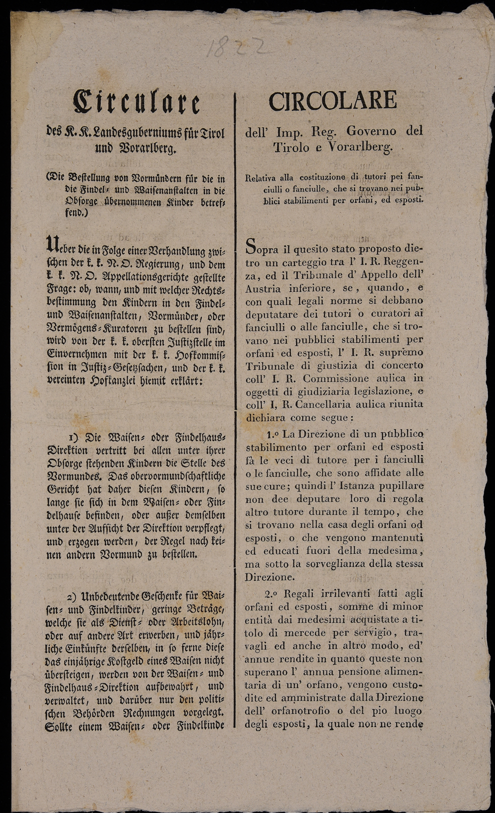 | Circolare dell'Imp. Reg. Governo del Tirolo e Vorarlberg relativa alla costituzione di tutori pei fanciulli o fanciulle, che si trovano nei pubblici stabilimenti per orfani, ed esposti |