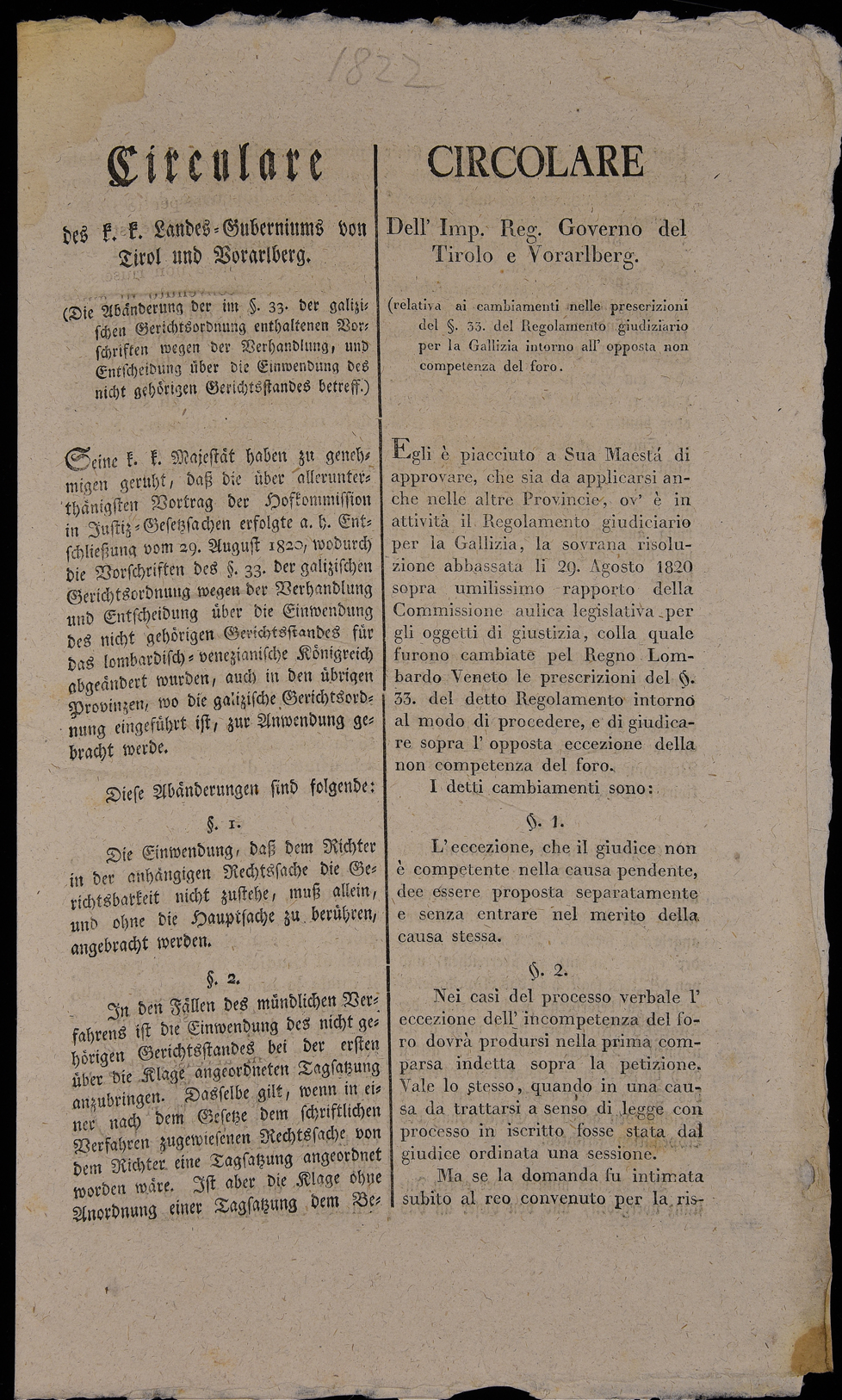 | Circolare dell'Imp. Reg. Governo del Tirolo e Vorarlberg (relativa ai cambiamenti nelle prescrizioni del §.33 del regolamento giudiziario per la Gallizia intorno all'opposta non competenza del foro) |
