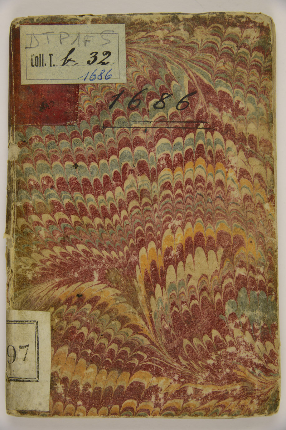 Legatura coeva in carta policroma incollata su cartoncino, talloncino di carta rossa di rinforzo al dorso, talloncino con antica segnatura di collocazione al dorso, mm. 155x100x5. Nota manoscritta al verso del piatto anteriore: Messe della santa Legha celebrate per li seguenti morti, l'elenco seguente è reso illeggibile dall'ex libris della famiglia Triangi incollato, al recto del piatto posteriore nota manoscritta della medesima mano: sino per l'anno 1686 ho celebrato messe per li miei morti di casa, si individuano tracce di numerazione che dovevano evidentemente tenere il conto delle messe, ma la parziale lacerazione della carta impedisce una lettura completa, nel calendario, in corrispondenza dell'inizio dei mesi, si incontrano due note manoscritte nei margini (VA), alle cc. A12r-A13v notazioni diaristiche manoscritte della stessa mano responsabile delle note ai piatti, solo parzialmente leggibili. Evidentemente l'esemplare fu in possesso di un religioso, che annotò le messe celebrate e utilizzò il calendario liturgico anche come una sorta di diario. Timbro della Biblioteca a c. A24v, numero d'inventario P/18427 al frontespizio, provenienza: famiglia Triangi, Collezione Mazzetti, antiche segnature di collocazione: 2597 (Mazzetti, al dorso), Coll. T b 32 (Comunale).