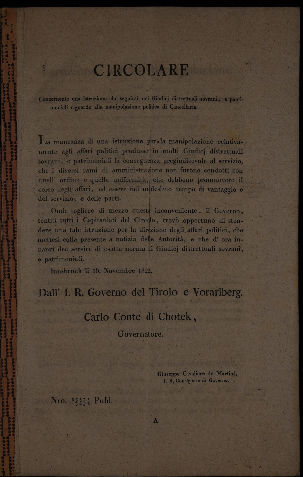 | Circolare concernente una istruzione da seguirsi nei Giudici distrettuali sovrani e patrimoniali riguardo alla manipolazione politica di cancellaria |
