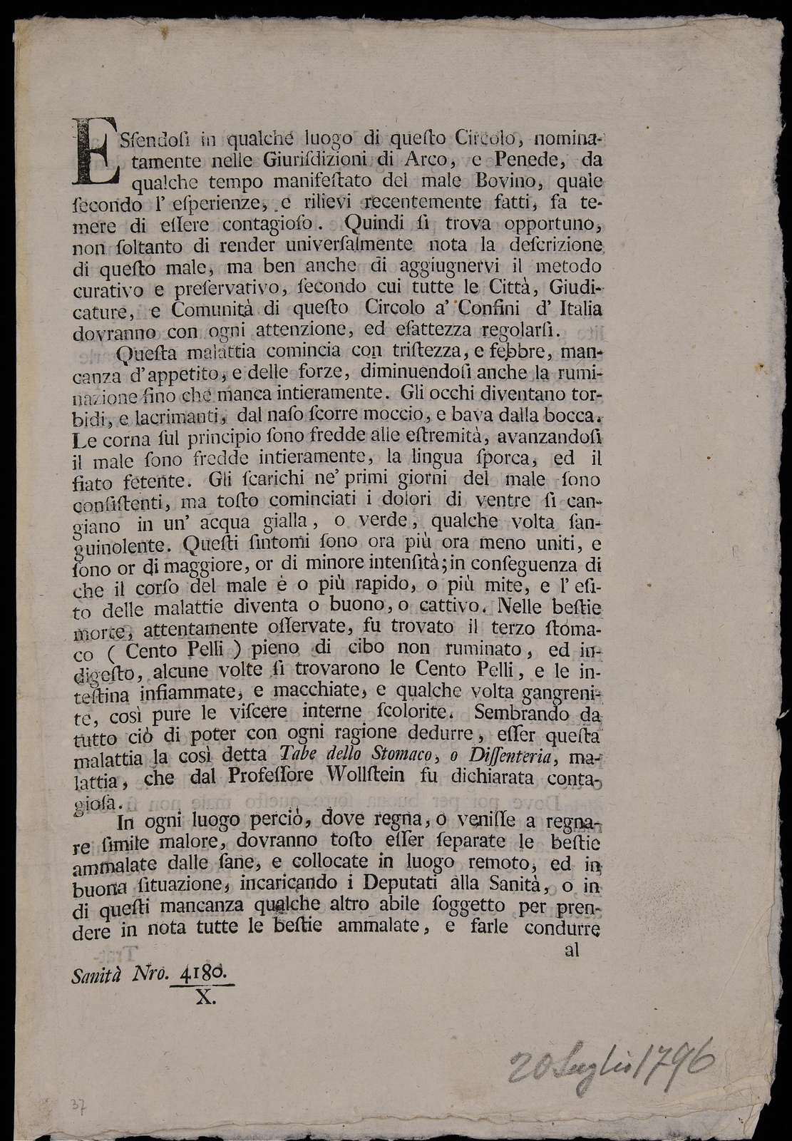 | Essendosi in qualche luogo di questo circolo, nominatamente nelle giurisdizioni di Arco e Penade da qualche tempo manifestato del male bovino ... |