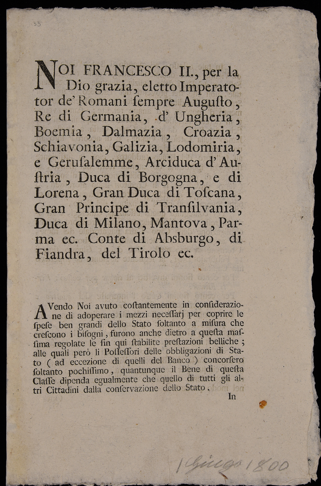 | Noi Francesco II per la Dio grazia eletto imperator de' Romani sempre Augusto re di Germania, d'Ungheria, Boemia, Dalmazia, Croazia, Schiavonia, Galizia, Lodomiria, e Gerusalemme, arciduca d'Austria, duca di Borgogna, e di Lorena, gran duca di Toscana, gran principe di Transilvania, duca di Milano, Mantova, Parma ec. conte di Absburgo, di Fiandra, del Tirolo ec. |
