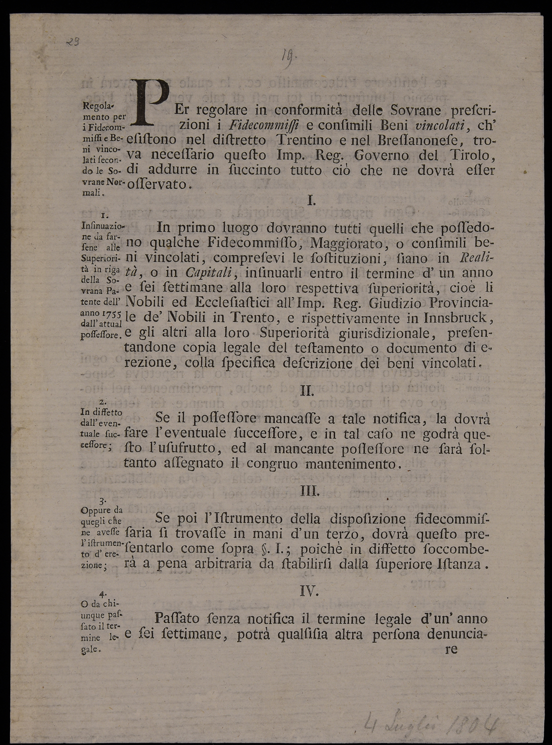 | Per regolare in conformità delle sovrane prescrizioni i fidecommissi e consimili beni vincolati, ch'esistono nel distretto del Trentino e nel Bressanonese, trova necessario questo Imp. Reg. governo del Tirolo, di addurre in succinto tutto ciò che ne dovrà esser osservato |