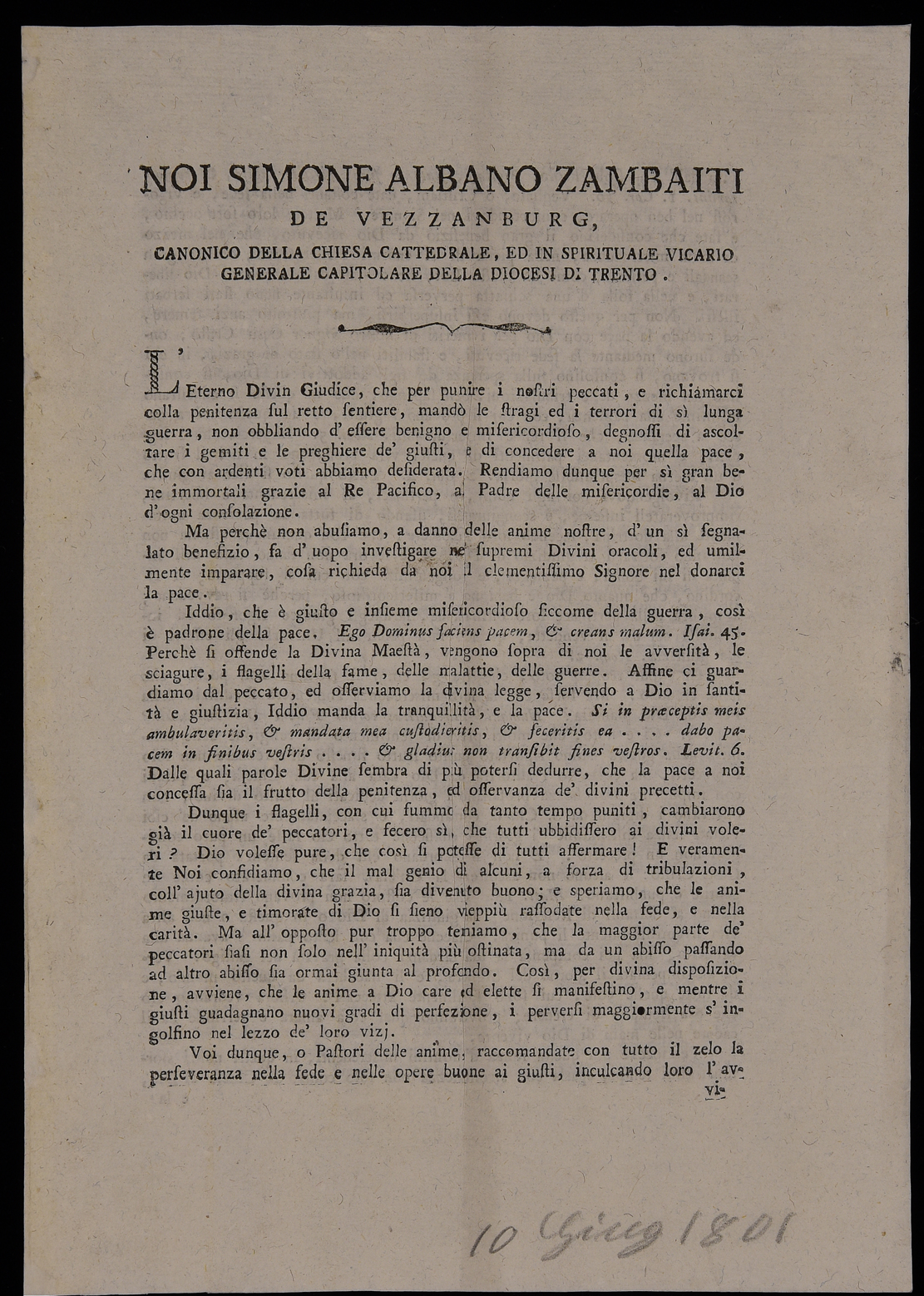 | Noi Simone Albano Zambaiti de Vezzanburg, canonico della chiesa cattedrale, ed in spirituale vicario generale capitolare della diocesi di Trento |