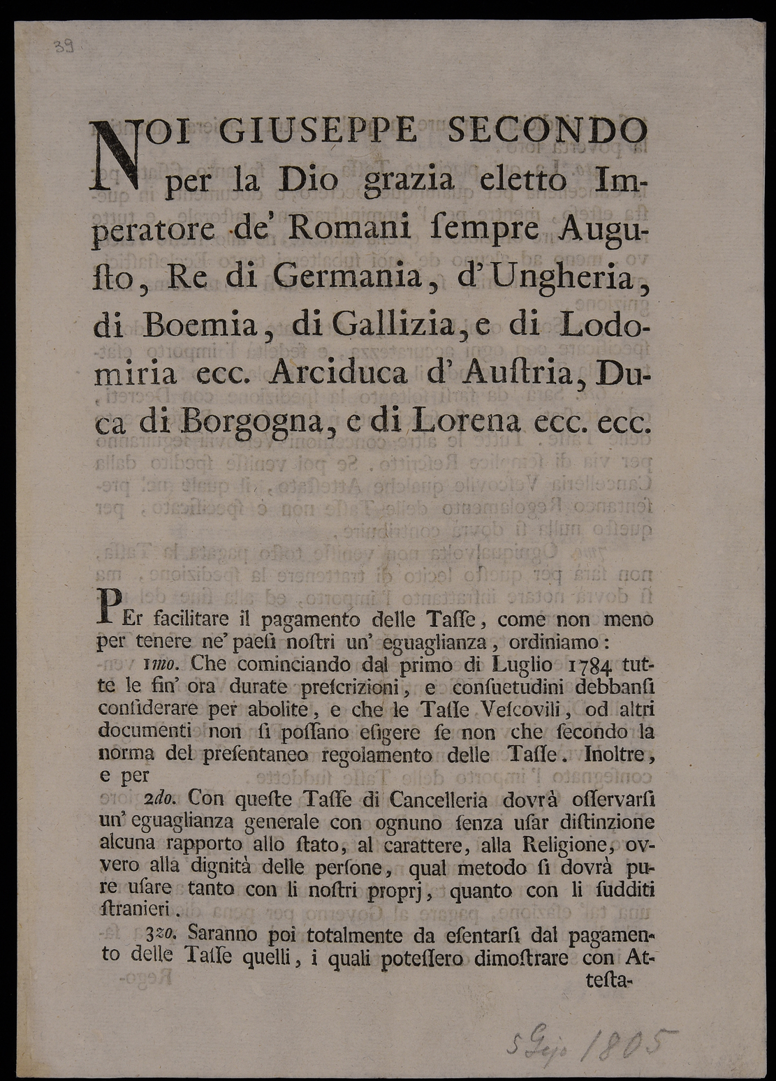 Noi Giuseppe secondo per la Dio grazia eletto Imperatore de' romani sempre...
