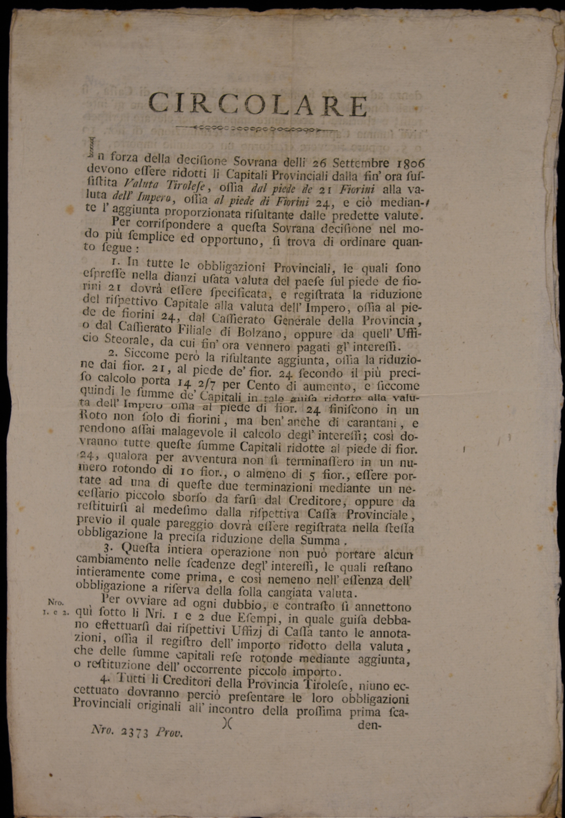 In forza della decisione sovrana delli 26 settembre 1806 devono essere ridotti li capitali provinciali ...