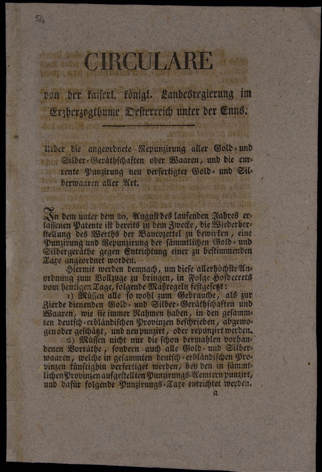 | Circulare der kaiserl. königl. Landesregierung im Erzherzogthume Oesterreich unter der Enns. Ueber die angeordnete Repunzirung aller Gold-und Silber-Geräthschaften oder Waaren, und die currente Punzirung neu verfertigter Gold-und Silberwaaren aller Art |