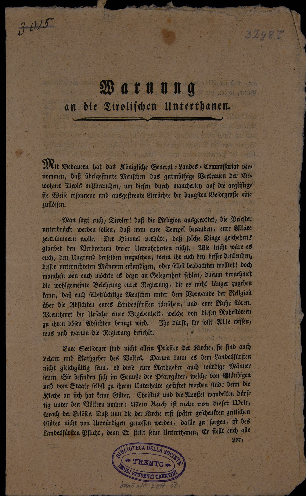 Mit Bedauern hat das königliche General-Landes-Commissariat vernommen, dass übelgesinnte Menschen das gutmüthige Vertrauen der Bewohner Tirols missbrauchen ...