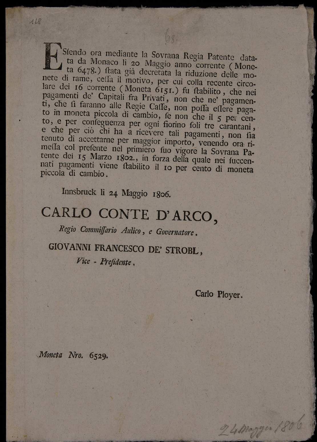 | Essendo ora mediante la sovrana regia patente datata da Monaco li 20 maggio anno corrente (moneta 6478.) stata già decretata la riduzione delle monete di rame ... |