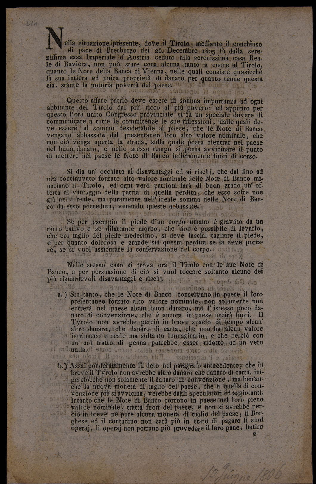 | Nella situazione presente, dove il Tirolo mediante il conchiuso di pace di Presburgo dei 26. decembre 1805 fù dalla serenissima casa imperiale d'Austria ceduto alla serenissima casa reale di Baviera ... |